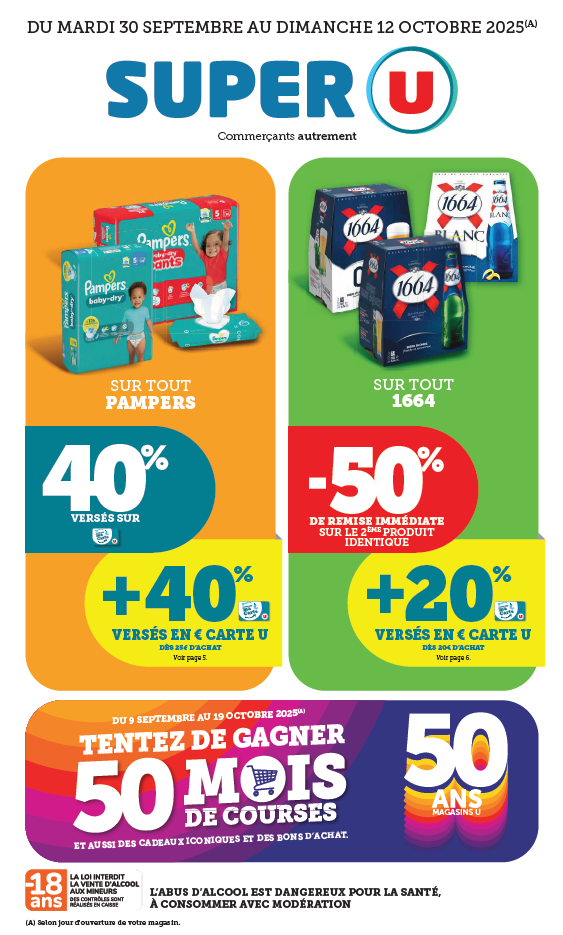 Sur présentation de la Carte U en magasin ou sur coursesu.com du 09 septembre au 19 octobre 2025 (jour de retrait ou de livraison), bénéficiez de 10 % en euros Carte U supplémentaires pour l'achat des produits U présents dans la liste "Ma Sélection Carte U" lors du premier passage en caisse éligible après l'activation de l'offre. L'offre est limitée à 7 utilisations maximum par semaine et par compte Carte U et doit être activée avant chaque passage en caisse. Liste des produits éligibles signalés en magasin et disponible à l'accueil et sur magasins-u.com. Offre valable en France métropolitaine (hors DROM-COM et Utile). Le montant cagnotté sera visible dans un délai de 1 à 3 jours sur votre espace fidélité.